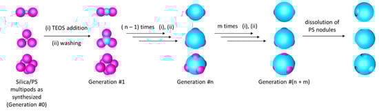 Scheme 1 shows the multi-step approach developed to synthesize patchy silica particles with controlled patch size from PS/silica multipods. It consists of growing the silica core of the silica/PS multipods used as templates through successive additions of a small amount of TEOS interspersed with centrifugation/redispersion cycles in order to eliminate the excess of unreacted TEOS molecules and the formation of silica protuberances at the surface of the PS lobes, which occurs when TEOS is added at once [22].