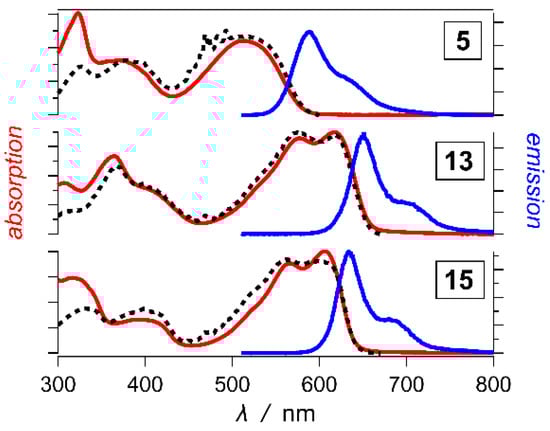 Absorption (red), excitation (dotted black), and emission (blue) spectra of compounds 5, 13, and 15 for DCM.