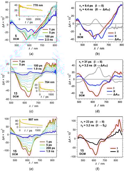 Transient-absorption dynamics of compounds 5, 13, and 15 for DCM. (a,c,e) Representative TA spectra of 5, 13, and 15 for DCM. Insets: the decays of the singlet excited states, 1DPP*, of 5, 13, and 15 (λex = 400 nm, 5 μJ per pulse). (b,d,f) Spectra of 5, 13, and 15 for DCM, representing the transitions associated with each of the time constants, τi, obtained from the decay associated difference spectra, αi vs. λ, that biexponential global fits produce, i.e., ΔA(λ, t) = ΔA∞(λ) + α1(λ) exp(−t/τ1) + α2(λ) exp(−t/τ2). (I and II—transition spectra; ΔA∞—spectra of transients with lifetimes that considerably exceeds the dynamic range of the pump-probe technique; S0—ground state). The nanosecond time constants, τ2, are obtained from TCSPC and introduced as set parameters to the global fit analysis.