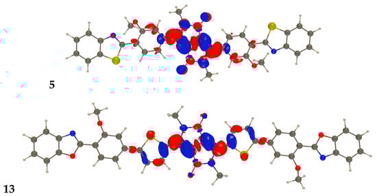 Indeed, the amount of transferred charged qCT amounted to ca. 0.3–0.4 e in all three dyes, clearly confirming the localized nature of the transition. Nevertheless, EDD of 5 indicates that the side benzene rings played a trifling role in the optical transitions (Figure 4). The EDDs of 13 and 15 on the other side, on the other hand, reveal that the thienyl moieties vicinal to the DPP core contributed to the optical transitions (Figure 4), which is consistent with their bathochromically shifted absorption (Figure 2, Table 1). This extension of the EDD was slightly more pronounced for the para-benzoxazole derivative, 13, than with the meta-one, 15 (Figure 4), which agrees with what the absorption spectra show (Figure 2).