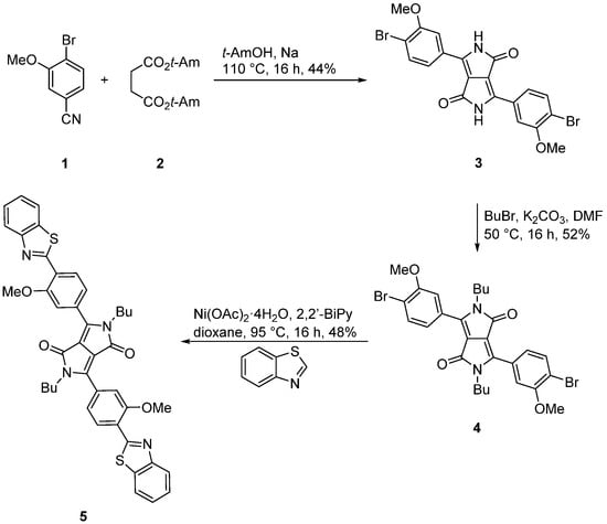 Therefore, we initiated our investigation with the preparation of DPP 3, which contains two 3-methoxyphenyl substituents. We recently learned that if classical diisopropyl succinate is used in reactions with 3,4-dimethoxybenzonitryle, the replacement of one or more methoxy groups with isopropyl groups is a side reaction. Therefore, we resolved this by using more sterically hindered bis(tert-amyl)succinate (2) in reaction with nitrile 1 (Scheme 1). The pigment 3 was subsequently N-alkylated under classical conditions to give DPP 4 in 23% overall yield (Figure S1). DPP 4 was subsequently used as arylating agent in direct arylation of benzothiazole under recently described conditions [83], leading to the formation of DPP 5 (Scheme 1, Figure S2).