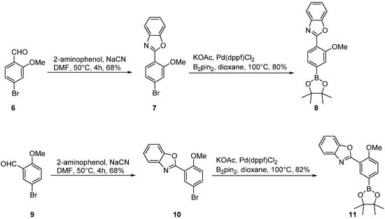 Independently, two regioisomeric methoxybenzaldehydes 6 and 9 possessing bromine atom were condensed with 2-aminophenol to give corresponding benzoxazoles 7 and 10 (Scheme 2, Figures S3 and S5). Subsequently bromine atoms were replaced with pinacolo-borane to give highly functionalized heterocyclic building blocks 8 and 11 (Figures S4 and S6).