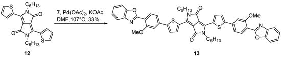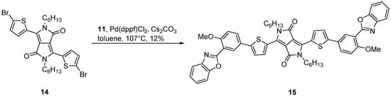 Interestingly, the synthesis of DPP 13 from DPP 14 and 8 via Suzuki coupling led to the formation of dye 13 in 1% yield only. Therefore, we resorted to direct arylation, which had recently become a major tool in the synthesis of dyes [84,85] (including DPPs) [86,87,88], and heterocyclic PAHs [89]. Gratifyingly, DPP 12 underwent smooth reaction with compound 7 under the reaction conditions developed by Doucet and co-workers [90], to afford the desired DPP 13 in 33% yield (Scheme 3, Figure S7). In contrast to that result, the Suzuki coupling of DPP 14 with benzoxazole 11 gave DPP 15 in reasonable yield (Scheme 4, Figure S8).