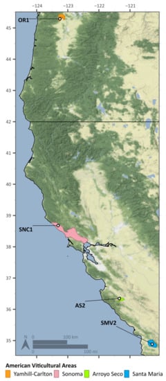 Geographical spread of vineyard sites included in this study. Sites range from the central coast of California up to Oregon. The American Vineyard Areas (AVAs) represented are: SMV2—Santa Maria Valley, AS2—Arroyo Seco, SNC1—Sonoma (Coast), and OR1—Yamhill–Carlton (Willamette Valley).