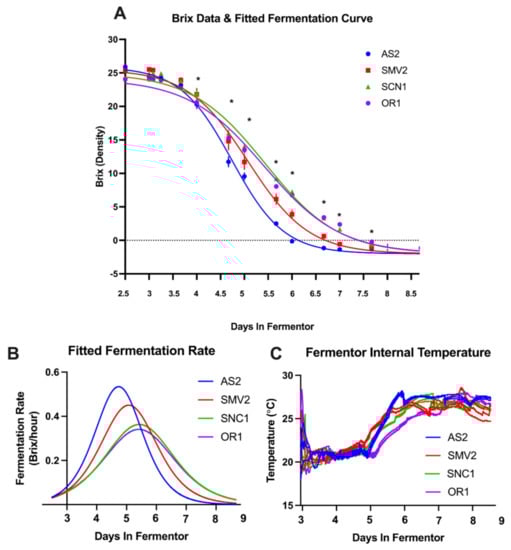 (A) The sigmoidal fitted curve reflects the decrease in density (Brix) proportional to the sugars consumed by the yeast; symbols denote manual sample points. A Brix value of 0 or below signals the end of alcoholic (primary) fermentation. The asterisk (*) between day 4 and 7.5 indicate where fermentations are significantly different from each other (as determined by Fisher’s least significant difference test, shown in Table S1, Supplementary Materials). (B) The fitted rate of fermentation plot shows the two faster fermentations (AS2/SMV2) display a higher initial rate of fermentation (i.e., rate of sugar consumption, Brix/h) than the two slower fermentations (SNC1/OR1). (C) The fermentor temperature of each replicate from inoculation through the end of fermentation (additional temperature data are reported in Supplementary Materials, Figure S1).