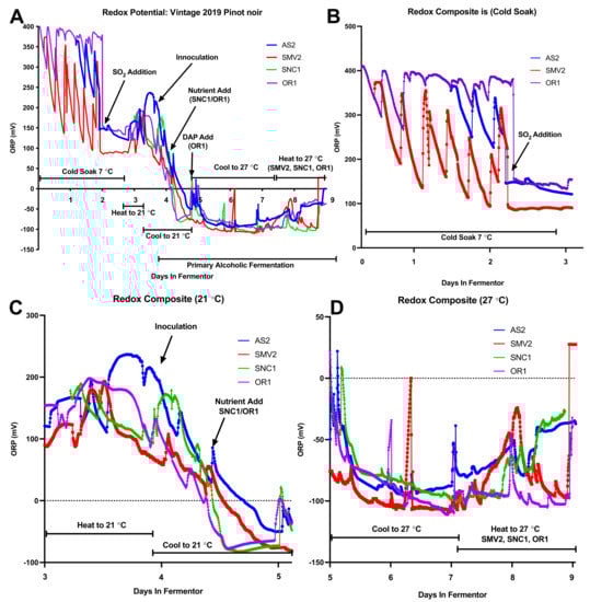 Each data point represents a 5 min interval. (A) Composite graph with the mean of all ORP measurements for each set of vineyard replicates over the entire time in fermentor. Process decisions are annotated, including changes to the temperature and nutrient additions. (B) The mean ORP measurements acquired during the initial 3-day cold soak period. The addition of SO2 caused an immediate decrease in the ORP value. (C). The mean ORP measurements acquired during initial heating, inoculation, nutrient addition, and the first ~24 h of fermentation. (D) The mean ORP measurements acquired during the middle and end of fermentation, including the period when temperature control was switched from cooling to heating (for selected conditions).