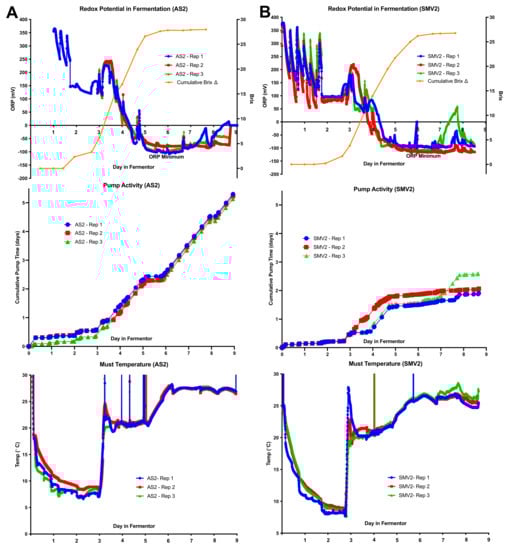 The AS2 replicates finish fermentation the fastest (by day 6), converting the majority of hexoses into ethanol between days 3 and 5 (Figure 4A). These replicate fermentations exhibit very similar trends in ORP, with the largest decrease in ORP corresponding to the maximum fermentation rate. During this period, the pumps for each fermentor were very active, mixing the fermentors to maintain the set temperature at 21 °C. Near the end of day 4, there is an abrupt increase in the ORP (~100 mV) due to almost constant pump activity maintaining 21 °C; once the temperature was adjusted to 27 °C, the pump activity ceased for ~1 day. After the abrupt increase in ORP, the ORP decreases to a minimum value of −100 mV on day 6, which is consistent with the metabolic shift from exponential to stationary phase (ORP Minimum). By days 7–8, the ORP increases, possibly due to air introduced from continuous mixing and because the yeast are less active at the end of fermentation, allowing the ORP to rise. The AS2 vineyard replicate fermentations were fairly consistent (Brix StdDev 0.22) and fermented the fastest. AS2 exhibited the highest cumulative pump activity (~5.5 days total) to maintain the temperature setpoints, corresponding with the fastest observed fermentations (Figure 4A).