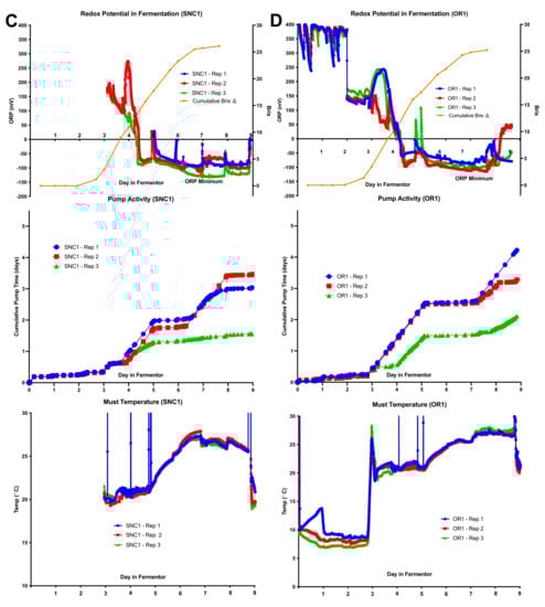 The SNC1 replicates fermented more slowly than AS2 and SMV2 but faster than OR1 (finishing between days 7 and 8). SNC1 replicate fermentations received a nutrient addition on day 4 (Figure 4C). The ORP drops dramatically (~200 mV) immediately after the initial nutrient addition, possibly indicating that the nutrient composition, as well as subsequent stimulation of yeast metabolism, causes the ORP to decrease. Between days 4 and 5, the pump activity of SNC1-Rep 1/2 diverges from SNC1-Rep 3, indicative of differences in the heat produced by these fermentations. These replicates reach their ORP minimum around the end of day 6. On day 7, the temperature changed from cooling to 27 °C to heating to 27 °C, causing the ORP for SNC1-Rep 1/2 to rise but not for Rep 3. The regular action of the pumps for SNC1-Rep 1/2 days 7–8 can be visualized by an elevated (~50 mV) ORP value compared to SNC1-Rep 3. The SNC1 replicates fermented more slowly than AS2/SMV2 but were fairly consistent (Brix StdDev 0.12). The disparity in cumulative pump run time between replicates (~1.5 days vs. ~3–3.5 days) reveals that the yeast in SNC1-Rep 1/2 was more active during days 4–5 and days 7–8, thus requiring more temperature control during this period than SNC1-Rep 3 (which required less pump activity).
