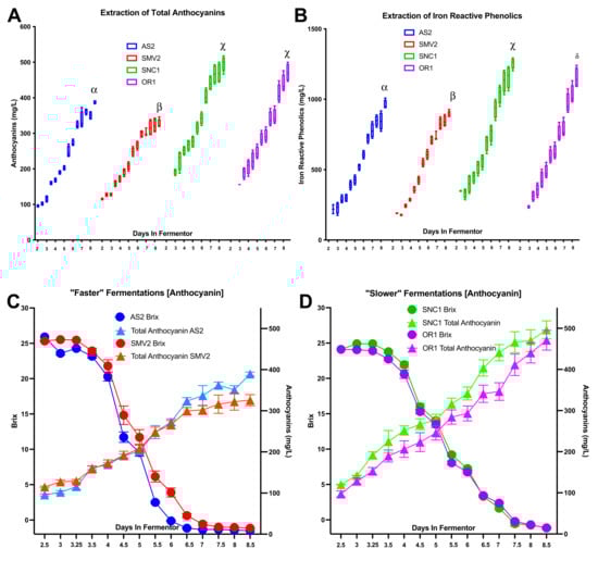 (A) Total anthocyanins over the course of fermentation, as measured by “Malvidin 3-glucoside equivalents”; Greek numerals denote significant differences in the values at the last time point as determined by Fisher’s LSD (least significant difference). (B) Total iron reactive phenolics over the course of fermentation, as measured by “Catechin equivalents”; Greek numerals denote significant differences in the values at the last time point as determined by Fisher’s LSD. (C,D) Visualization of fermentation kinetics between “faster” (C) vs. “slower” (D) fermentations and extraction of total anthocyanins (similar trends observed for iron reactive phenolics, data not shown). The “faster” site displayed a lower rate of extraction than “slower” sites, as reported in Figure 1B. Despite the “slower” fermentation kinetics, the amount of anthocyanins is relatively high for these conditions than in the “faster” conditions.