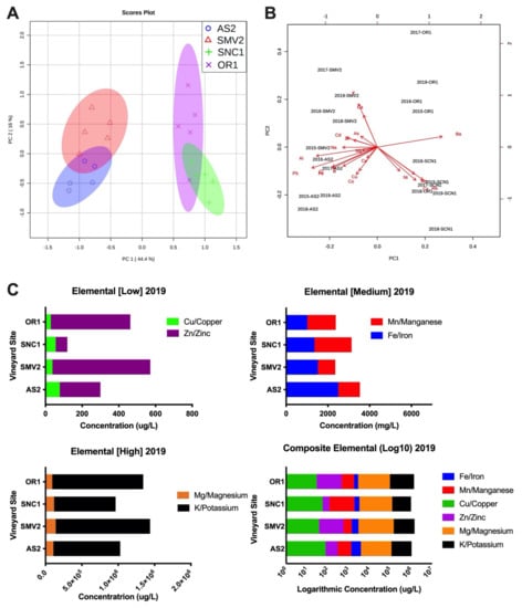 (A) Principal Component Analysis plot of elemental concentration and composition of the four vineyard sites; this analysis shows a clear segregation of the two “faster” and “slower” fermenting vineyard sites. PC1 captures 44.4% of the variation in the data set, while PC2 captures 16% of the variation in the data set. The ellipses represent a 95% confidence region. (B) As part of the same PCA analysis, the biplot shows the relative impact of which elements are driving the segregation of vineyard sites and vintages along PC1 (44.4%) and PC2 (16%). (C) Scaled concentration of yeast and redox relevant elements from the 2019 vintage; note the ratio of Fe/Mn between the faster (AS2/SMV2) sites vs. slower sites (SCN1/OR1). Check Supplementary Materials, Figure S3, for more Fe/Mn ratios.