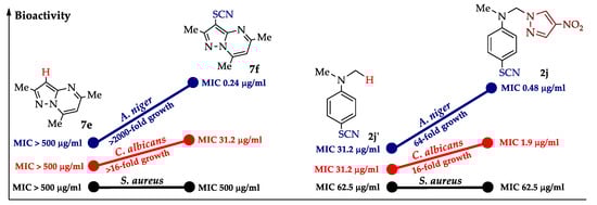 Thiocyanation of the C–H bond of arenes is an effective tool for C–S coupling [81,82,83,84]. The resulting aryl thiocyanates are valuable precursors of sulfur and nitrogen-containing compounds (thiols [85], (di)sulfides [86,87], dithiocarbamates [88], thiazoles [89], tetrazoles [90]), and are highly bioactive compounds (antifungal [91], antitumor [92], antiparasitic [93]). Recently synthesized thiocyanates of pyrazole derivatives also have sufficient antifungal [94] and antitumor [95] activity.