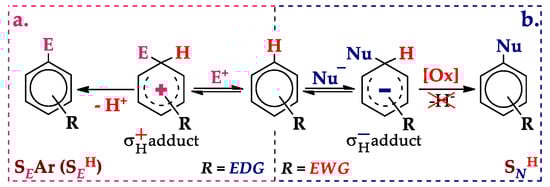 Electrophilic (a) and nucleophilic (b) aromatic hydrogen substitution.