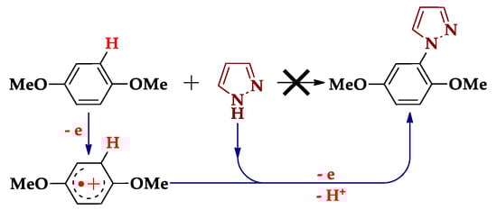 This review is devoted to electrooxidative functionalization of pyrazoles. Why is it so attractive? The answer is given by Seebach [10], who showed that the interaction of two near-polar co-reactants is provided by the polarity inversion of one of them. This is the essence of electrochemistry, where the electrode transformation of the substrate is accompanied by its polarity inversion. For example, 1,4-dimethoxybenzene (DMB) and pyrazole (Scheme 2) are two non-interacting nucleophiles, but polarity inversion of DMB by electrooxidation leads to the electrophilic radical cation that reacts with pyrazole. In the electrochemical literature, this C‒H functionalization is called anodic substitution, which has been actively studied since the mid-1950s [11,12,13,14,15,16,17,18,19,20].