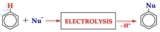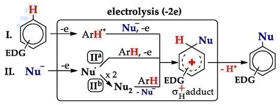 Only recently we have introduced the concept of anodic substitution as an electrochemical aromatic substitution of hydrogen [21,22]. Such reactions were designated as SNH An (An is anode), since the key stage is anodic oxidation of the substrate. For electron-rich arenes, the processes proceed along two main routes (Scheme 3), depending on the ease of oxidation of nucleophile vs. arene [21]. Route I (arene oxidizes easier than Nu−) proceeds via the interaction between Nu− and the arene radical cation. Route II (Nu− oxidizes easier than arene) proceeds via the formation of Nu•, which either interacts with the arenes homolytically (route IIa) or forms a dimer that interacts with the arene as an electrophile (route IIb).
