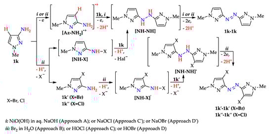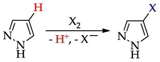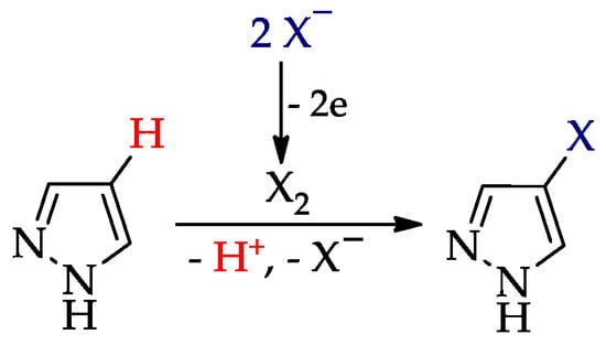 The halogenation (Scheme 6) usually proceeds [26] via the electrogeneration of a halogen followed by its interaction with pyrazole (cf. Scheme 3, route IIb).