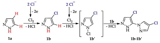 C–H An chlorination of pyrazole 1a (Table 1, entry 1) led to 4-chloropyrazole 1b (yield 46%) and to by-product 1b′ (yield 8%) in H2O–CHCl3 at the theoretical amount of electricity passed (Q/Qt = 1). Apparently, the product 1b undergoes chlorination to 1,4-dichloropyrazole 1b′ (Scheme 7), followed by C–N dehydrogenative cross-coupling to by-product 1b-1b′.
