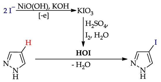 A much more effective iodinating agent was HOI, which can be obtained by the reaction of KIO3 with KI (or I2) and H2SO4 [75,76,77,78,79]. The original process [74] includes the electrogeneration of KIO3 (on the NiO(OH) anode [80]), followed by the interaction of HOI generated in situ with the pyrazole (Scheme 8). As a result, the yields of target products increased to 74–93% (entries 1, 2, 4, 8, 10–12, 13).