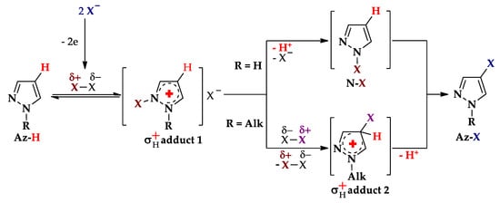 Since I−, Br−, and Cl− are commonly oxidized at lower anodic potentials than the studied pyrazoles, the process proceeds via the electrooxidation of Hal− to Hal2 followed by interaction of the latter with arenes (see Scheme 3, route IIb and Scheme 6). The possible mechanism [26,71,79] (Scheme 9) includes the initial attack of the halogen on the N2 of Az–H with the formation of σH+ adduct 1. The latter, depending on the R, gives either N–X intermediate (R = H) or σH+ adduct 2 (R = Alk). Therefore, the target Az–X is formed either due to N–C rearrangement of N–X derivative or due to the deprotonation of σH+ adduct 2.