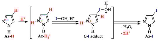 Iodination by HOI proceeds similarly, but for highly basic N-unsubstituted pyrazole and its alkyl derivatives it most likely occurs (Scheme 10) via C–I adduct (the result of protonation of N2 and HOI attack on C4) [74,75,77,78,79].