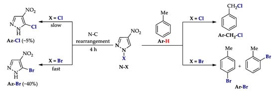 Additional control experiments showed different properties of N–Cl and N–Br intermediates (Scheme 11). Therefore, the N–C rearrangement of the N–Cl derivative is significantly lower than that for the N–Br (cf. stages N–X→Az–Cl and N–X→Az–Br). At the same time, for the N–Cl bond, homolytic cleavage is observed, while for N–Br it is heterolytic (cf. stages N–X→Ar–CH2-Cl and N–X→Ar–Br).