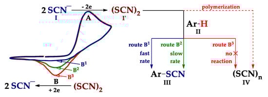 These processes were investigated by cyclic voltammetry (CV) [22,123,125,126]. Scheme 13 shows a typical CV curve of SCN−. Peak A corresponds to the oxidation of thiocyanate ion I to thiocyanogen I′, which is detected on the reverse scan by its reduction peak B (B3). If after the addition of arene II, peak B disappears (cf. peaks B1 and B3) or decreases (cf. peaks B2 and B3), then Ar–H II interacts with (SCN)2, respectively, via the route B1 or B2 to form the target Ar–SCN III. If the peak B does not change, then Ar–H II does not react with (SCN)2 (see peak B3 and route B3). In this case the main reaction product is polythiocyanogen IV.