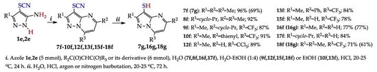 These patterns and approaches are considered below on the examples of C–H An thiocyanation of the practically useful [128,129,130] derivatives of 5-aminopyrazole and pyrazolo[1,5-a]pyrimidine and the original electrosynthesized 1-(hetero)arylpyrazoles [124,131].