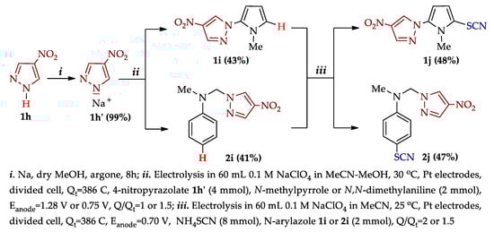 - Yaubasarova, R.R.; Kokorekin, V.A.; Ramenskaya, G.V.; Petrosyan, V.A. Double electrooxidative C–H functionalization of (het)arenes with thiocyanate and 4-nitropyrazolate ions. Mendeleev Commun. 2019, 29, 334–336. [Google Scholar] [CrossRef]