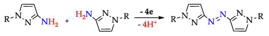 - Lyalin, B.V.; Sigacheva, V.L.; Kokorekin, V.A.; Petrosyan, V.A. A new synthesis of azopyrazoles by oxidation of C-aminopyrazoles on a NiO(OH) electrode. Mendeleev Commun. 2015, 25, 479–481. [Google Scholar] [CrossRef]