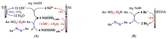 - Lyalin, B.V.; Sigacheva, V.L.; Kokorekin, V.A.; Petrosyan, V.A. Electrosynthesis of azopyrazoles via the oxidation of N-alkylaminopyrazoles on a NiO(OH) anode in aqueous alkali—A green method for N-N homocoupling. Tetrahedron Lett. 2018, 59, 2741–2744. [Google Scholar] [CrossRef]