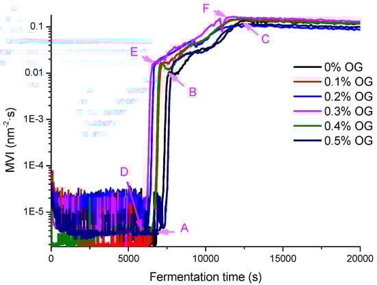 MVI can directly reflect the viscosity characteristics of the system. It can be seen from Figure 2 that, as a function of fermentation time, the fermentation process of the set-type yogurt is a multistage process. Before fermentation, MVI for the set-type yogurt without OG was 0.4 × 10−5 at 117.6 min (point A), which was called the initial stagnation stage with low viscosity. Additionally, the fermentation of the set-type yogurt started and the fermentation process entered the rapid viscosity change stage. The viscosity was increased rapidly. At 128.3 min (point B), MVI was 0.01, 2500 times, compared to that of the MVI before fermentation. This is because fermentation led to a gradual decrease in the pH and an increase in the acidity. At the same time, casein particles aggregated to form a gel network structure, which led to an increase in the viscosity of yogurt []. At 215.4 min (point C), the set-type yogurt enters the high viscosity stage. The fermentation process ended and a stable gel system was formed. At this stage, MVI increased to the maximum (point C; 0.13), which was 3250 times and 1.3 times, compared to that of the initial stagnation stage and the high viscosity stage, separately.