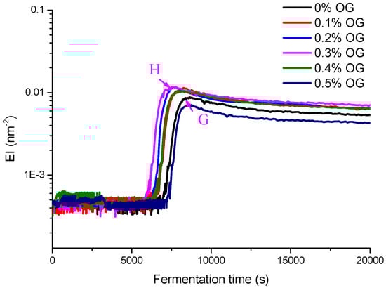 As a function of time, EI can directly reflect the elastic characteristics of the set-type yogurt. As can be seen from Figure 3, when the set-type yogurt was in the initial stagnation stage, the EI value remained unchanged. As the fermentation process entered the rapid viscosity change stage, the EI value was increased. When the fermentation time was 145 min (G point), the yogurt system without adding OG had the maximum EI value of 0.0085. When the fermentation time was 129 min (H point), and 0.3% OG was added, the EI value reached the maximum value (0.0117). It is generally believed that the gelation rate of yogurt is mainly affected by the temperature and the lactic acid bacteria type. However, the gel point of the set-type yogurt with 0.3% OG was shortened by 16 min, compared with that of without OG. Thus, as a functional food ingredient, OG enhanced the nutritional and functional properties of set-type yogurt and shortened the fermentation time, thus increasing the production efficiency.