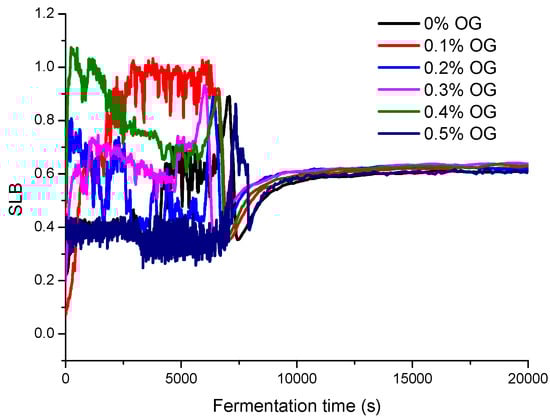 The SLB value curve of set-type yogurt with different OG concentrations (0%, 0.1%, 0.2%, 0.3%, 0.4%, and 0.5%) during fermentation.