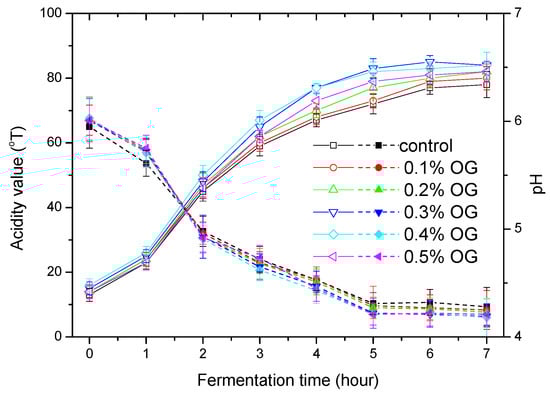Changes of titrated acidity and pH during fermentation of set-type yogurt with and without OG addition.