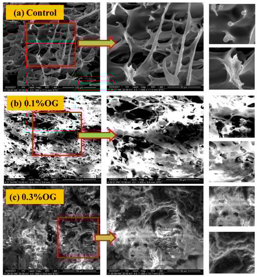 In general, the three-dimensional network structure of yogurt is considered to be formed by the aggregation of casein. As shown in Figure 6a, the casein aggregates were clearly seen in the set-type yogurt without OG. No lactic acid bacteria were observed (Figure 6a). The reason is possible that the lactic acid bacteria were damaged during vacuum freeze-drying, which was used in the sample pretreatment process. However, there were some high-brightness aggregates that adhered to the casein network. We hypothesized that these aggregates were the whey and exopolysaccharides [].