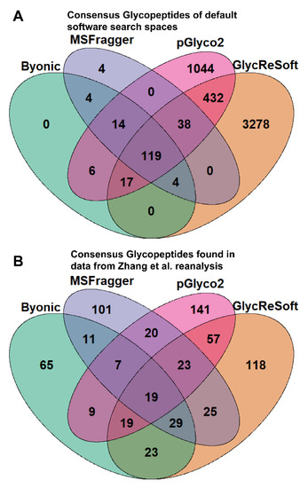 Figure 1B shows the consensus of glycopeptides found by each software in the Zhang et al. reanalysis; these results run counter to the glycan proportion. Each software has a plurality or majority of their results unique to themselves. We can see that search space is not the predominant determinant in the differences between these results. If one were to filter post search to the glycans found only in all searches, these overlaps do not experience any large shifts in proportion. This can be seen in Figure S3c.
