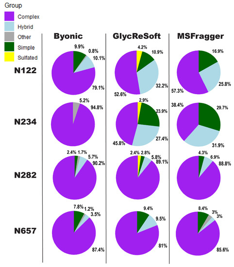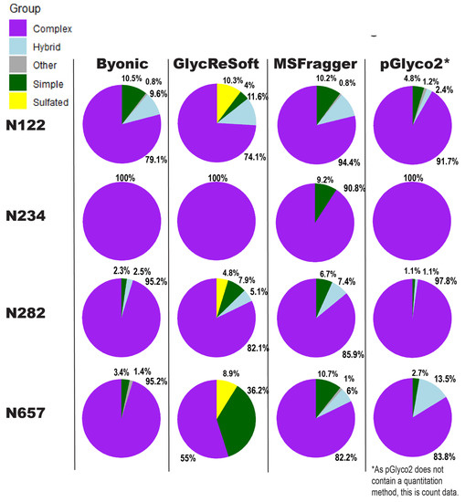 In Figure 3, the sites show different consensus behaviors compared to the Watanabe et al. data reanalysis. With the assumption that pGlyco2’s results are skewed by comparing spectrum counts to log abundances, N122 appears to be a fairly good consensus, with GlycReSoft differing due to both sulfation and phosphorylation. N234 would be a consensus of wholly complex glycans were it not for MSFragger’s discovery of simple glycans. N282 has differing results; all softwares agreed it was overwhelmingly complex, but GlycReSoft and MSFragger found 2–4 times the amount of simple and hybrid glycans that Byonic and pGlyco2 found, along with some phosphorylation from GlycReSoft. The most differing site is that of N657 wherein Byonic found few simple glycans among the complex. GlycReSoft found over a third of the occupancy as simple glycans, and a further tenth were phosphorylated glycans. MSFragger-Glyco found that a tenth of the signal came from simple glycans and observed hybrid glycans; pGlyco2 observed even more hybrid glycans than MSFragger.