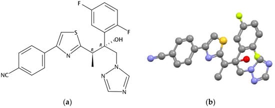 Invasive fungal infections, such as aspergillosis and the rather rare mucormycosis, remain the main cause of disease and death in immunocompromised patients [1,2,3,4,5]. The triazole class of antifungal drugs includes first-line preparations for treatment of diseases caused by a number of medicinally important strains of opportunistic fungi [6,7,8,9]. Isavuconazole (IVZ) is a new second-generation hybrid of thiazole and triazole with a wide spectrum of antifungal activity and favorable pharmacokinetic and pharmacodynamic profiles and is the only new antimycotic agent for systemic use that has been registered in the last 10 years. The isavuconazole structural formula is shown in Figure 1.