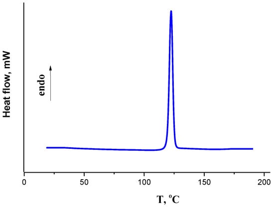 The isavuconazole thermal stability was studied by the DSC method within the temperature range from 25 to 250 °C. The DSC curve shown in Figure 2 has an endothermic peak of melting at Tm (onset) = 392.75 ± 0.2 K. The drug melting enthalpy (∆mH), which equals 29.9 ± 0.5·kJ·mol−1, was calculated based on the area under the melting peak curve limited by the baseline. Uncertainties for melting parameters correspond to expanded uncertainty of the mean (0.95 confidence level). No additional phase transitions were found between the temperature of 298 K and the melting point of the studied compound, which confirms that there were no polymorphic modifications or hydrated forms.