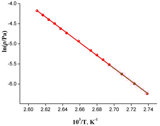 Figure 3 presents the dependence of the saturated vapor pressure of the studied compound on reciprocal temperature that is described by the equation ln(p/Pa) = (37.48 ± 0.17) − (15,959 ± 66)/T with the correlation coefficient R = 0.9999. For the calculation, we used the assumption that isavuconazole molecules in the gas phase were in the monomolecular state, which was confirmed by the low saturated vapor pressure values (0.001–0.01 Pa) within the respective temperature range and linearity of the vapor pressure temperature dependence.