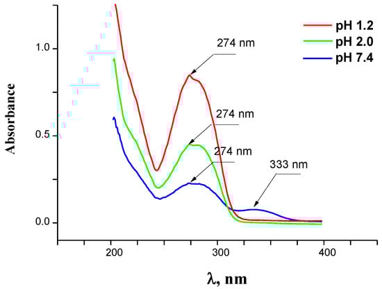 The IVZ absorption spectra in buffer solutions (pH 1.2, 2.0 and 7.4) were obtained within the range from 200 to 400 nm and are shown in Figure 4. The UV spectra of the compound aqueous solutions at all the pH values have an intensive absorption band with a maximum at 274 nm. As the acidity becomes lower, a new absorption band is formed around 333 nm. The adsorption maxima at 274 and 333 nm in the buffer solutions correspond to π-π* and n-π* transitions in the aromatic parts of isavuconazole. The changes in the UV spectra at various pH values are caused by ionization of the molecules of the compound under study.