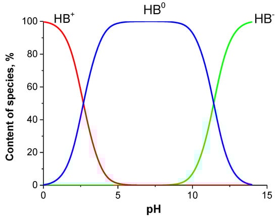 The Henderson–Hasselbalch equation and dissociation constants were used to determine the content of molecular and ionized forms of isavuconazole molecules at different pH values of buffer solutions (Figure 5) [24].