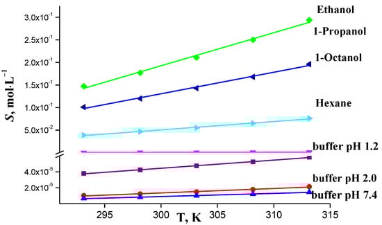 The solubility of the drug compound increases with the temperature in all the studied solvents, as the experimental data show (Figure 6). The biggest temperature gradient of solubility is found in hexane. The isavuconazole solubility in hexane is higher than in buffer solutions, which is explained by the dispersion interactions of nonpolar aromatic fragments of the IVZ molecule with the hexane nonpolar molecules. The isavuconazole solubility in alcohols is much higher than in hexane and buffer solutions, which is associated with the formation of hydrogen bonds during the interaction of proton acceptors of the aromatic and heterocyclic systems of the dissolved drug with the hydroxy group of the alcohol molecules. The IVZ solubility increase in the series of alcohols from 1-octanol to ethanol is explained by the growing solvent capacity for specific interactions [25].