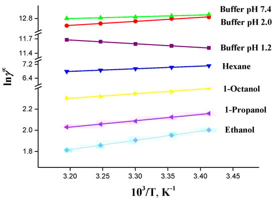 In all the solute–solvent systems, positive deviation from ideality (γ∞ > 1) was observed, which indicates a weak intermolecular interaction of IVZ when aqueous and organic solvents are used. An analysis of the data obtained shows that the drug activity coefficients in the buffer solutions (pH 2.0 and 7.4) and organic solvents become lower as the temperatures increase, which is associated with the solute–solvent interactions and solubility growth. In the buffer solution (pH 1.2), the drug activity coefficients become slightly higher as the temperature grows (Figure 8).