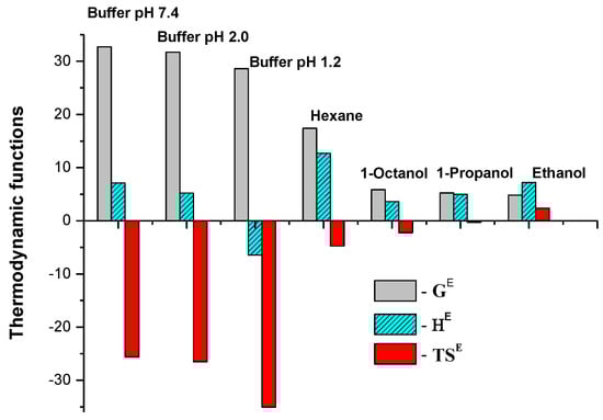The enthalpy and entropy contributions shown in Table 7 indicate that in the systems with hexane and alcohols, the entropy term is lower (ζTSE < 32%) than in the buffer solutions, where this contribution is the factor that determines the solubility (ζTSE > 78%).