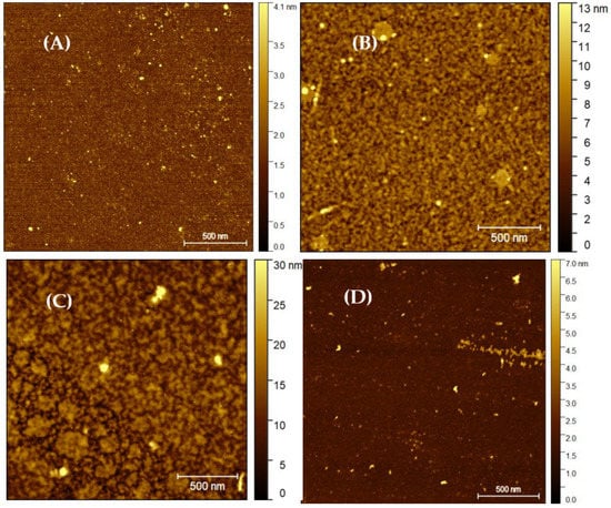 In this work, dried samples on a silicon substrate were imaged using AFM in the non-contact mode. In this mode of operation, the cantilever vibrates at a natural resonant frequency and with a low amplitude above the sample surface. As the cantilever approaches the surface, the forces of attraction and repulsion modify the resonant frequency of the cantilever, which is coupled to the surface. Controlling this frequency allows for adjustment of the tip–sample distance. Then, it becomes possible to map the sample surface. Figure 2 shows the maps after each sample preparation stage and before the LACT loading stage.