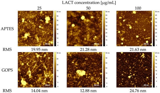 The AFM images obtained for the surfaces on which the uEVs were applied are summarized in Figure 4. In Figure 4, two types of silanes and three concentrations of LACT protein on which the uEVs were applied are presented. For samples with uEVs, an increase in Sq RMS surface roughness was observed for the first two concentrations for both silanes. Meanwhile, for APTES, for the concentration of 25 µg/mL, the Sq RMS value was 19.95 nm; for the concentration of 50 µg/mL, it was 21.28 nm; and, for 100 µg/mL, the roughness value slightly decreased. The values for the second type of silane, GOPS, were 14.04 nm at 25 µg/mL, 12.88 nm at 50 µg/mL, and 24.76 nm for the highest concentration (100 µg/mL).