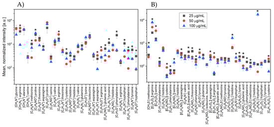 The graph in Figure 6A shows the mean normalized intensities for most of the characteristic peaks (in positive polarity) of amino acids. For the ions for which a statistically significant difference was found between the intensities for the three selected concentrations of the GOPS silane-functionalized silicon substrate, the designation “*” was assigned. For positively charged ions, statistically significant differences were found for 14 out of 32 masses placed on the diagram; in most cases, the highest intensities were obtained for the lowest concentration (25 µg/mL). The results obtained for the negative polarization confirmed the relationships found using the positive polarization.