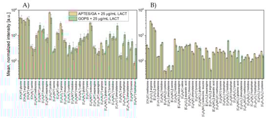 The graph in Figure 7 summarizes the results of the mean normalized intensities for two types of surface functionalization. The first functionalization was based on the use of 3-aminopropyltriethoxysilane (APTES) with glutaraldehyde as a difunctional reagent, and the second with the use of 3-glycidyloxypropyltrimethoxysilane (GOPS). Figure 7A shows the results for 32 masses where, for 11 masses, higher intensities were obtained with the APTES functionalization. In the case of negative polarization, 34 masses were included in the analysis, in which case higher APTES intensities were noted for 18 masses.
