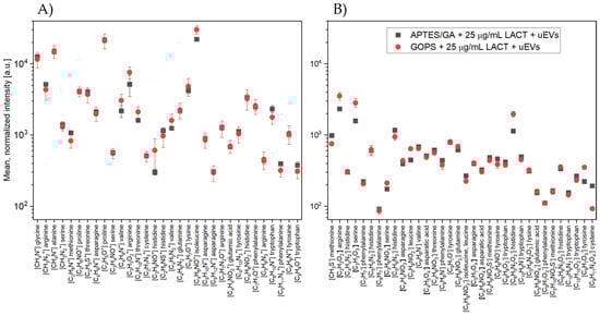 Figure 8. Values of mean normalized intensities for characteristic peaks of amino acids in (A) positive and (B) negative polarity, compared to the used silanes (APTES and GOPS), with uEVs applied to properly functionalized surfaces at a concentration of 3 × 109 particles/mL. These data refer to the LACT protein concentration of 25 µg/mL.
