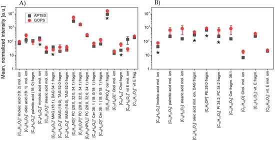 Figure 9. Values of mean normalized intensities for characteristic peaks of lipids in (A) positive and (B) negative polarity, compared to the used silanes (APTES and GOPS), with uEVs applied to properly functionalized surfaces at a concentration of 3 × 109 particles/mL. These data refer to the LACT protein concentration of 25 µg/mL. The index “*” means a statistically significant difference at the level of p = 0.05 for the studied groups.